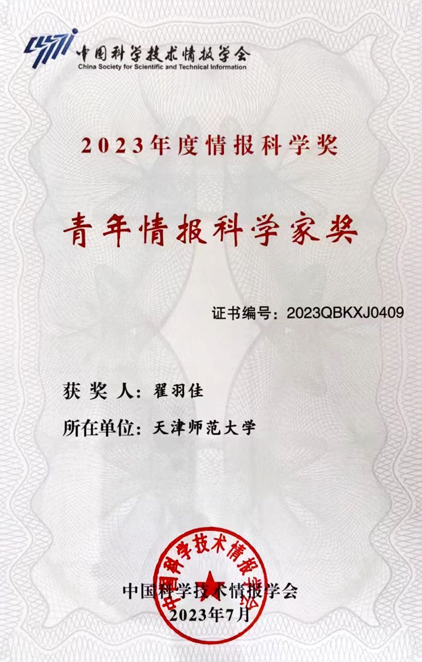 2023年7月11日,“2023年中国情报学年会暨情报学与情报工作发展论坛和第十三届全国情报学博士生学术论坛”发布了第四届中国科学技术情报学会情报科学奖获奖名单,太阳成集团tyc33455cc翟羽佳副教授凭借其在情报学研究领域的突出成就荣获“青年情报科学家奖”。