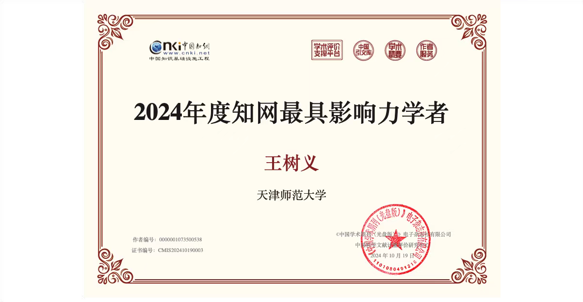 知网"最具影响力学者"的评选标准极为严格。入选学者需在近十年内发表至少一篇PCSI指数高于1.65的期刊或会议论文,且其发表的论文PCSI指数之和必须位于前1%。王树义副教授不仅有4篇文章入选知网"高PCSI论文",其中3篇更是同时被评为"高被引论文"与"高下载论文",充分体现了其研究成果的高质量和广泛影响力。