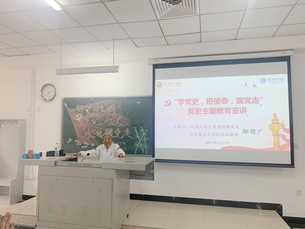 邸老先生今年已87岁高龄,曾作为革命英烈后代受邀到北京参加抗日战争胜利70周年庆祝活动,现场观看阅兵仪式。邸老的家庭是一个了不起的革命家庭,他的大伯,父亲,三叔,四叔先后为抗战胜利献出了宝贵的生命,之后他的五叔和六叔又毅然投入了革命事业。邸老自己也是一位坚强的“革命英雄”,他自幼因为亲人是革命人士,受到日本鬼子的围追堵截,有家不能回,四处东躲西藏,生活异常艰难。长大后,邸老珍惜来之不易的学习机会,立志做一位传播火种的老师,退休后还坚持学习,读书看报,发挥余热,他是百年党史的一位见证人,亲历者,也是一位践行者。讲座中,他激情澎湃,运用生动的事例和亲历的感受,向在场的听众娓娓道来在当年那个年代,是怎样一批热血青年,共产党员,仁人志士,用自己的献血和生命换来了今天的美好生活,他的讲座让很多师生深受感染,潸然泪下。同时,邸老自己的成长经历也鲜明的映衬我们现在是多么的幸福,他告诫同学们要珍惜现在,感恩共产党,沿着习近平总书记提出的‘不忘初心、牢记使命’宗旨,认真学习党史,感悟践行,以愚公移山的精神,为人民干实事,成为一名出色的党员,为社会主义现代化建设添砖加瓦。